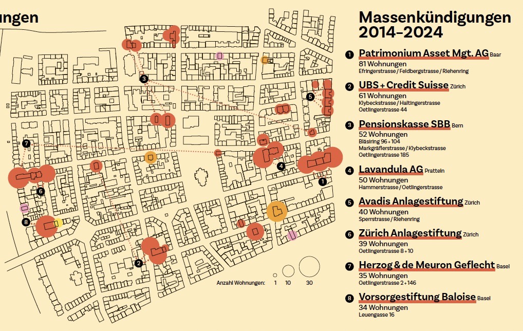 Although each of the posters shows striking differences, they all have one thing in common: a powerful shift of real estate properties is becoming visible. Financialization of housing means institutionalized investors (collecting stock market money, state-funded pensions, or investors´wealth) are buying up development sites and existing housing blocks on a massive scale, while small private landlords who live in and their own homes are becoming a rare phenomenon. This transformation of houses into assets for speculation fundamentally changes neighborhoods. The use value of a home as a lived space becomes secondary. In a financialized logic of real estate markets, the potential profit from homes becomes the primary driving force. While the result remains the same, the tactics may differ once profit is established as the primary goal of an apartment. Renters face increasing rents and/or displacement. Be it by buying-low and selling-high strategies; disinvestment by cutting maintenance costs; luxury renovations to raise rental income; or mass cancellation of rental contracts to allow new renters to be charged premium prices. Once rental prices start to increase in a neighborhood, there is an incentive to convert formerly affordable housing into profitable apartments. The slow expulsion of economically disadvantaged people as well as rapid gentrification through mass cancellations of rental contracts is destroying tenants’ homes. In the case of Basel, these tenants make up over 80% of the entire population. The result is that people lose their homes, institutional investors raise their profits, and most renters struggle to keep up with rising housing costs.