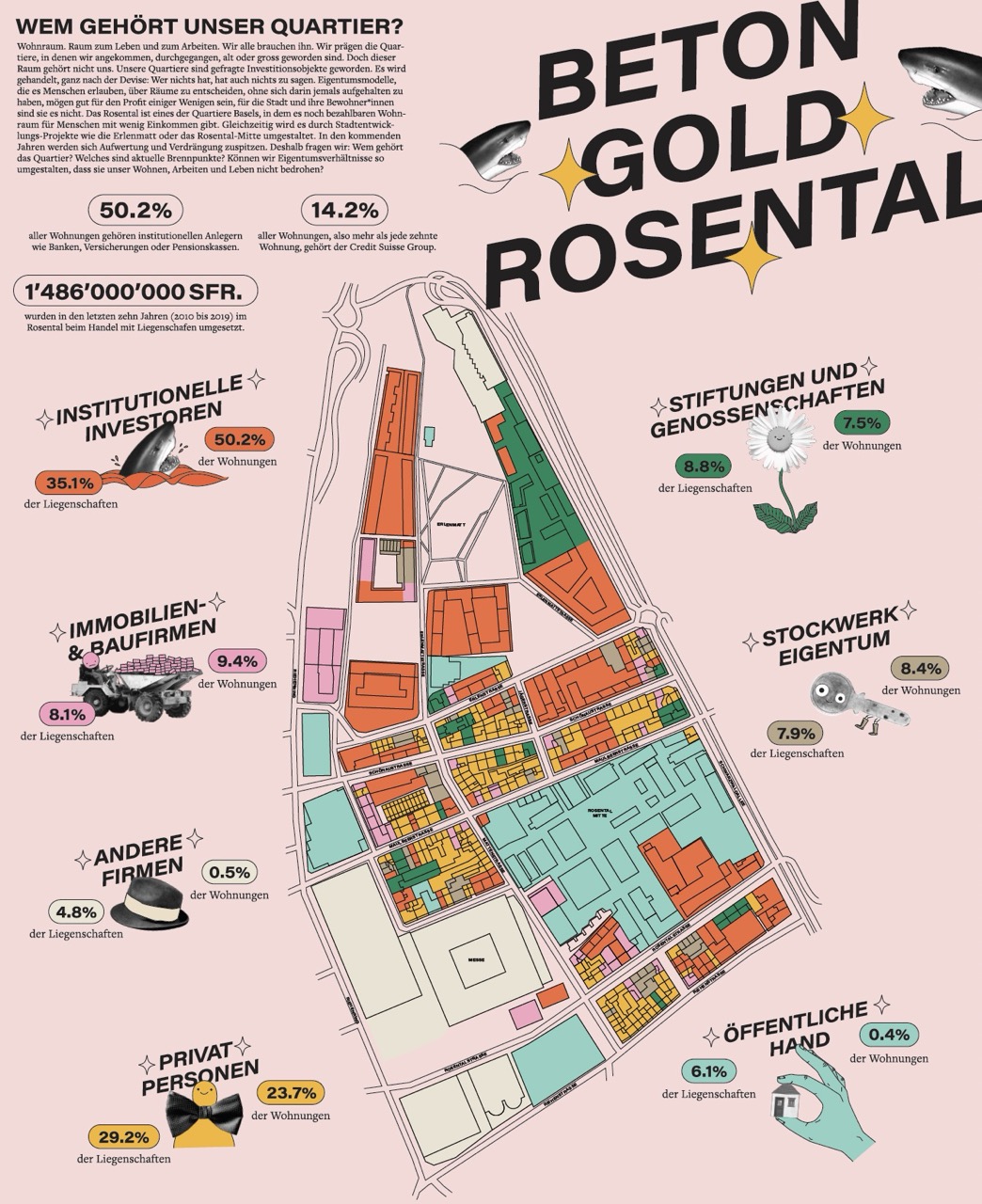 On the other hand, the posters should be seen for what they are: the final product of a long and intense process of collaborative knowledge creation within a non-hierarchical structure built on voluntary engagement. By now, the posters have begun to take on a life of their own. They circulate in unknown spaces and are discussed at conferences in Bonn and Frankfurt. They are presented to housing activists in New York and hang in kitchens in Basel and offices in Zürich. They serve as a reminder that any understanding of the housing crisis must address the issue of what primarily organizes housing – the real estate market, whose foundations lie in private property laws that are strictly enforced, mostly benefiting a few while often harming the many. Concrete Gold, where the wealth is invested and new riches amassed from our monthly rents, is a key driver of urban inequality. While the project Betongold alone cannot challenge the mechanisms driving the financialization of housing, we hope that a process of collective, bottom-up knowledge production can work as relevant intervention. By creating an attractive presentation, we aim to deconstruct the statistics and silence surrounding the opaque real estate market. We also provide facts that illustrate that, despite fake news, there is evidence. Institutional investors in Basel are ready to continue buying up homes and cancelling affordable rental prices, as long as real estate remains a profitable business rather than a tool to satisfy peoples’ needs for homes.