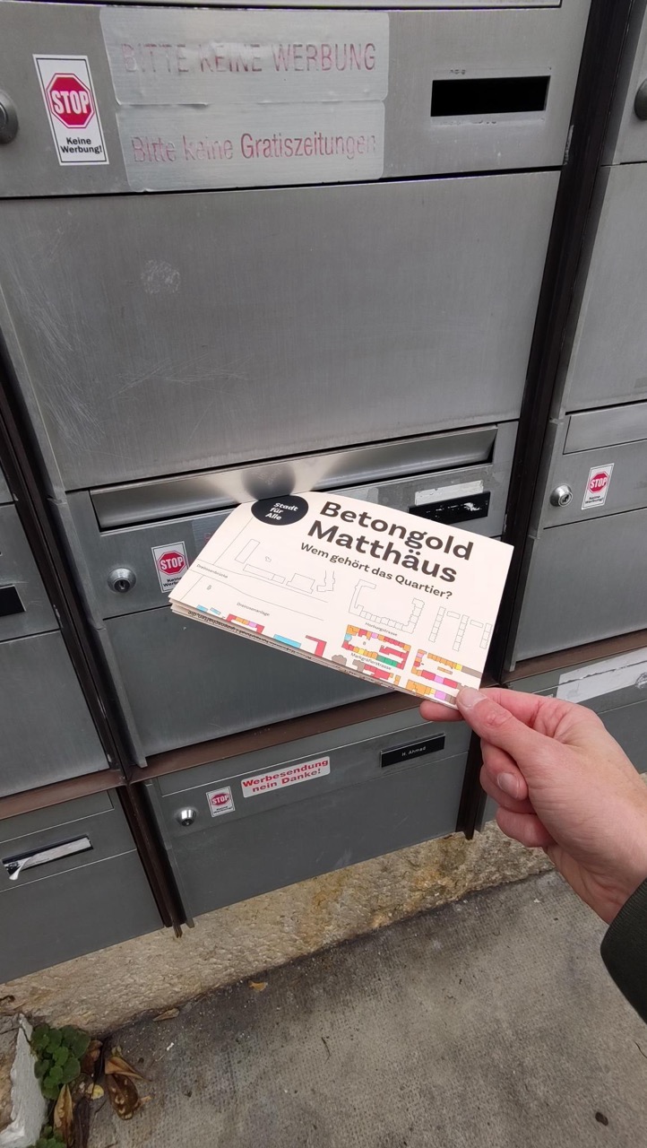 The fourth and final step was the dissemination. As a grassroots initiative, our association Stadt für Alle has always sought to democratize debates about urban transformations. By making evidence publicly available, we show with facts that displacement and changes in property relations are not isolated incidents, but significant shifts in property ownership from individuals to institutional investors are reflected in the data. Our target audience was not just urban elites in planning departments or at universities, but literally every resident living in the neighborhoods that the posters focused on. We printed 4,000 to 8,500 copies of each poster and, in a collective action, distributed them to every single postbox in the neighborhood, hoping that people would read them or even hang them on their kitchen or bathroom doors, as they often do. The free dissemination of the printed posters included invitations to public discussion rounds. Debates on how changing property relations affect the places we live in were further elaborated on during urban walking tours, or courses at the University of Basel.
