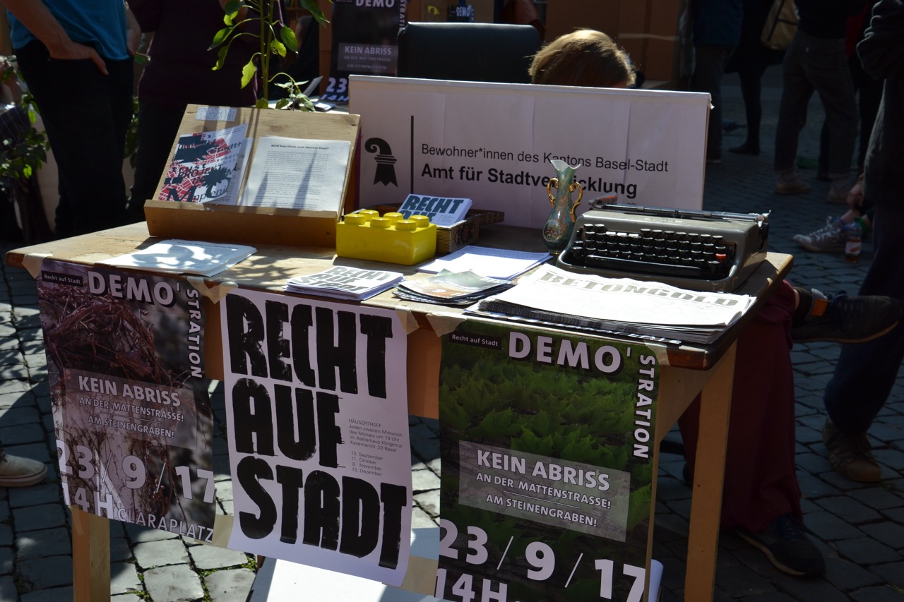 The poster series Betongold emerged out of years of research and activism. Two intertwining threads of organization – a right-to-the-city movement and a group of activist researchers – led us to establish our independent association: Stadt für Alle Basel (City for all). The right-to-the-city group in Basel started in 2016 on a Wednesday night at a collectively run bar. Nils Boeing – a long-term housing activist from Hamburg – delivered an inspiring talk sharing experiences from Hamburg’s right-to-the-city movement, when a group of Basel residents decided to get together. In a lose format, we began to meet weekly, reading theory and learning from urban struggles past and present. Reading and discussing led to action – overcoming the isolation of atomized individual houses fighting for their right to stay. During dozens of meetings, we started producing flyers, posters, stickers, a manifesto and a brochure about the right to the city in Basel. We also mobilized for protests and organized public actions including the temporary occupation of the Marktplatz square in the city center. These interventions created a tight-knight community and eventually led to the establishment of a monthly gathering to bring together tenants struggling to keep their homes. The Häusertreff (literally meaning houses’ meeting) was born. Every second Wednesday of the month, we gathered in this meeting open to everyone to discuss and get support for their struggles against cancellations, as well as to plan and prepare solidarity interventions. The project developed quickly and trust amongst people, houses, and projects began to grow.