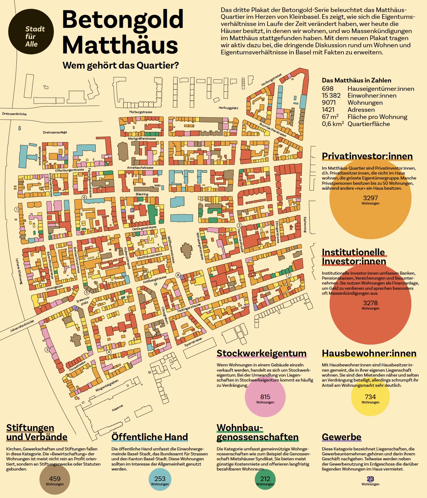The Betongold poster began as an experiment. We decided to map the ownership of each and every house in Basel’s Rosental neighborhood, an area, where a former industrial zone was being transformed into a residential housing complex, side by side with the autonomous housing project of Mattenstrasse. The residents of this project had played a pivotal role in establishing our right-to-the-city movement. Next, we created a second poster, examining the neighborhoods of Klybeck and Kleinhüningen, an area of relatively low income and in which every second resident is denied voting rights because they are not Swiss citizens. Another major brownfield development in the former harbor area had induced early gentrification here, with real estate investors speculating on rising land prices. In 2024, we completed the third poster project on the neighborhood of Matthäus, which is one of the most densely populated neighborhoods of Switzerland, hosting small shops, bars, coffeeshops, and handcraft enterprises in some of the backyards. Matthäus is a hip area that has seen various waves of gentrification while still being a central site for alternative culture in the city. Most of these neighborhoods mapped, have a significant migrant population, making up almost half its residents. The same applies to our current mapping of Gundeli, the former working-class neighbourhood located ‘behind’ the central station, in 2025.