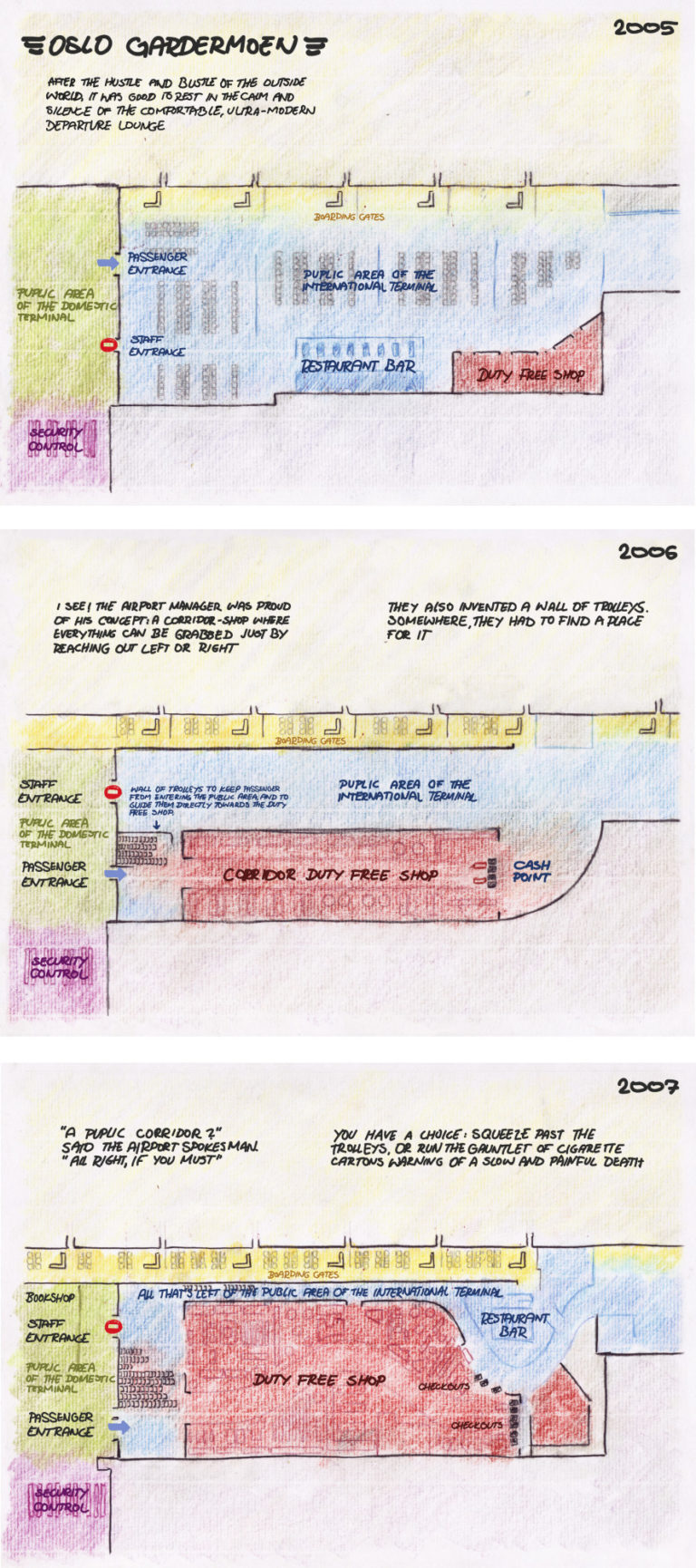The following maps are the result of a long-term observation process that I made in many airports mainly in Europe. At the same time they represent a symbol. The Observation Process The maps show how the general public, and specifically the passengers, are moving in a space carefully designed by an “invisible” force. By this […]