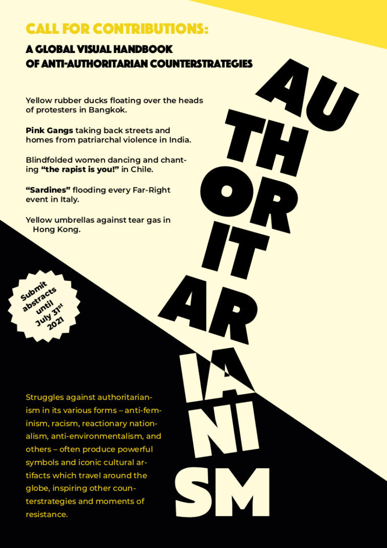 Activists, artists, engaged scholars and reporters!Call for contributions – A Global Visual Handbook of Anti-Authoritarian Counterstrategies – is online! Submit abstracts by 31.07.21. We are looking for creative, artistic/activist or academic contributions particularly from the Global South. Find the call here (available in English, French, Spanish, Portuguese, Arab and Russian)