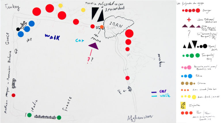 From Afghanistan to France The map presented here (see map right column) sketches a trail of exile from Afghanistan to France. It was created by H.S., who was seeking asylum in France when we met. H.S. attended the cartographic workshops titled Crossing Maps that artists and researchers in geography organized with other asylum seekers and […]